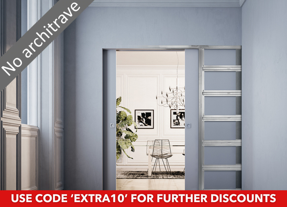 Strong galvanised steel frame. A quick-click frame that assembles into a complete unit comprising of full pocket, track and doorpost. The Syntesis® Flush range has been designed to be the strongest of its type on the market, flex is reduced to a minimum using stronger aluminium profiles and reinforced joints to reduce the risk of plaster cracking to a very minimum. - Runners